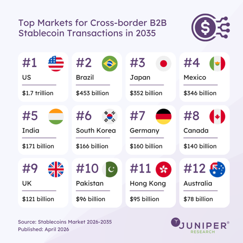 Hampshire, UK – 27th April 2026: A new study from global tech strategists Juniper Research has found the total value of cross-border B2B stablecoin transactions will reach $5 trillion by 2035, from $13.4 billion in 2026.