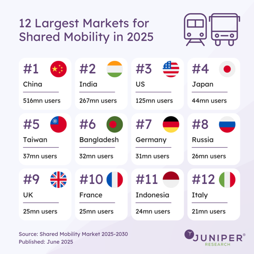 Hampshire, UK – 23rd June 2025: A new study from Juniper Research, the foremost experts in sustainability and smart cities markets, has revealed that the global userbase for shared mobility will grow 46% over the next three years; from 1.4 billion users in 2025 to over 2 billion in 2028.