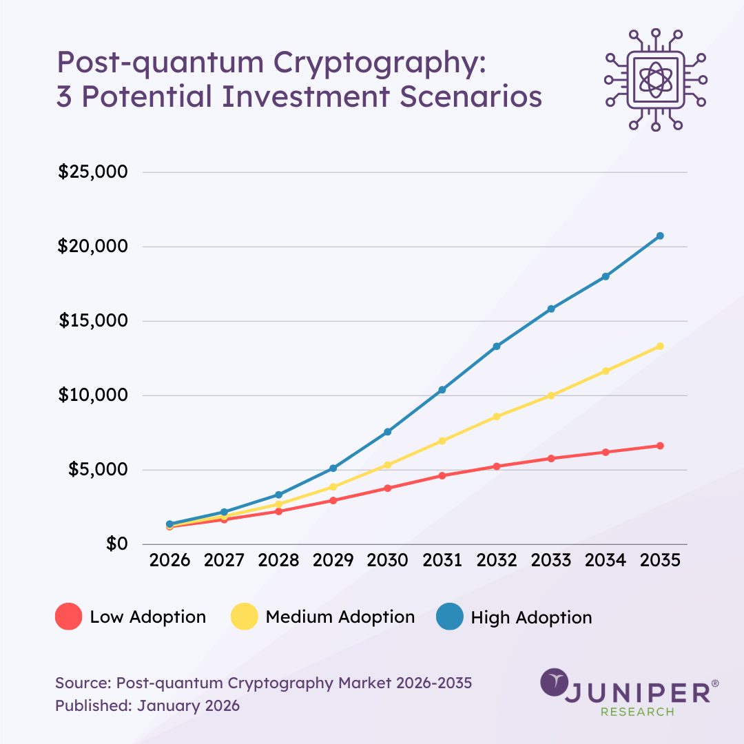 Scenario-based forecasting allows us to model how investment could evolve under different adoption speeds, rather than presenting a single, misleading trajectory. In doing so, it provides enterprises, vendors, and policymakers with a more realistic framework for planning investment, prioritising readiness, and managing cryptographic risk over the long term.