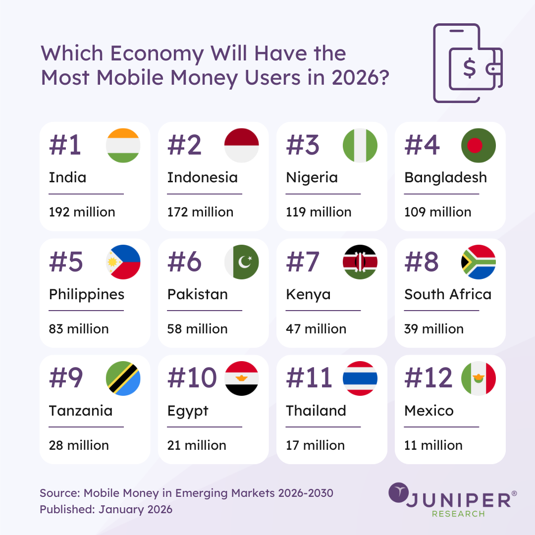 However, as our latest forecasts demonstrate, that framing no longer holds. By 2026, mobile money platforms will be serving hundreds of millions of active users across some of the world’s largest and fastest-growing economies. India alone is on track to reach nearly 200 million mobile money users, with Indonesia, Nigeria, and Bangladesh not far behind.
