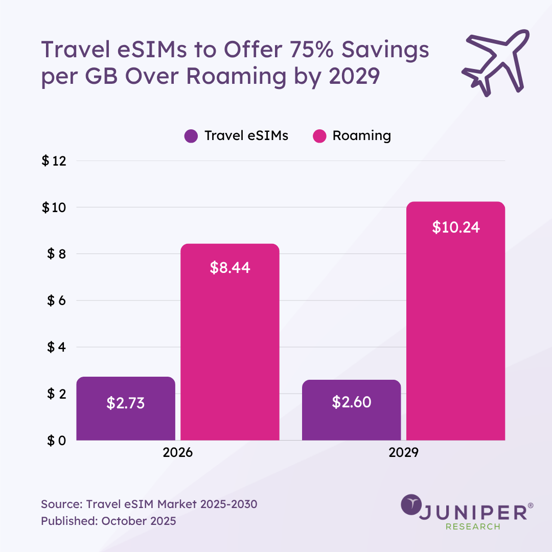 The cost of staying connected abroad has long been a pain point for travellers. But that’s changing fast. Travel eSIMs — digital SIM cards that can be downloaded in seconds — are rapidly transforming how people access data overseas. According to our latest research on the matter, travellers are set to save around 75% per GB of data compared to traditional roaming services by 2029. So, what’s behind these dramatic savings?